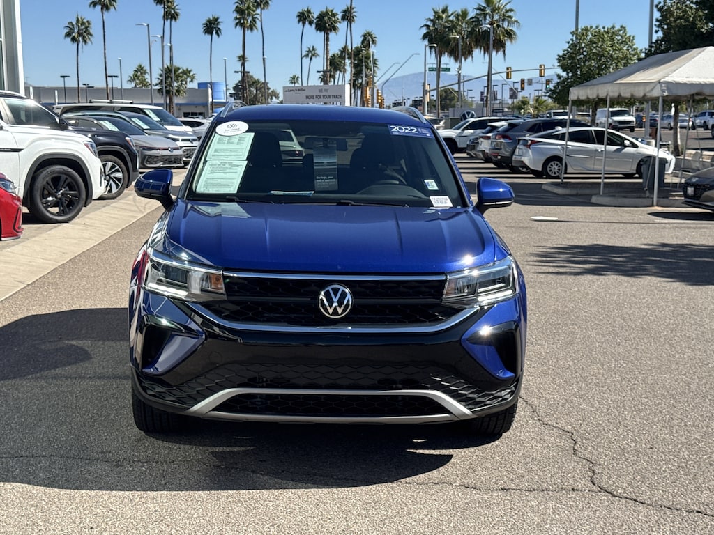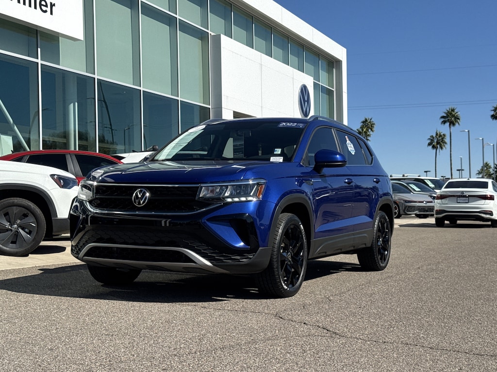 This 2022 Dusk Blue Metallic Volkswagen Taos 1.5T SE FWD is well equipped and includes these features and benefits: Volkswagen Certified Pre-Owned Certified, 18 Black Alloy Wheels, 3.23 Axle Ratio, 4-Wheel Disc Brakes, 6 Speakers, ABS brakes, Air Conditioning, Alloy wheels, AM/FM radio: SiriusXM with 360L, Brake assist, Bumpers: body-color, Cargo Area Retractable Privacy Cover, CloudTex & Cloth Seating Surfaces, Compass, Delay-off headlights, Driver door bin, Driver vanity mirror, Dual front impact airbags, Dual front side impact airbags, Electronic Stability Control, Emergency communication system: Car-Net, Exterior Parking Camera Rear, First Aid Kit, Front anti-roll bar, Front Assist, Front Bucket Seats, Front Center Armrest, Front reading lights, Front Strut Rear Torsion Beam Suspension, Front wheel independent suspension, Fully automatic headlights, Heated door mirrors, Heated Front Comfort Seats, Heated front seats, Illuminated entry, Leather Shift Knob, Low tire pressure warning, Occupant sensing airbag, Outside temperature display, Overhead airbag, Overhead console, Panic alarm, Passenger door bin, Passenger vanity mirror, Power door mirrors, Power driver seat, Power steering, Power windows, Radio data system, Radio: MIB3 Composition Media AM/FM/HD, Rear anti-roll bar, Rear seat center armrest, Rear Traffic Alert, Rear window defroster, Rear window wiper, Remote keyless entry, Roadside Assistance Kit, Roof rack: rails only, Rubber Mats Kit (SNM), Security system, Security Wheel Locks & Dust Caps (4 each) w/Key, Speed control, Speed-sensing steering, Split folding rear seat, Spoiler, Steering wheel mounted audio controls, Tachometer, Telescoping steering wheel, Tilt steering wheel, Traction control, Trip computer, Variably intermittent wipers, and Wheels: 18 2-Tone Machined Alloy. Volkswagen Certified Pre-Owned Certified, 18 Black Alloy Wheels, 3.23 Axle Ratio, 4-Wheel Disc Brakes, 6 Speakers, ABS brakes, Air Conditioning, Alloy wheels, AM/FM radio: SiriusXM with 360L, Brake assist, Bumpers: body-color, Cargo Area Retractable Privacy Cover, CloudTex & Cloth Seating Surfaces, Compass, Delay-off headlights, Driver door bin, Driver vanity mirror, Dual front impact airbags, Dual front side impact airbags, Electronic Stability Control, Emergency communication system: Car-Net, Exterior Parking Camera Rear, First Aid Kit, Front anti-roll bar, Front Assist, Front Bucket Seats, Front Center Armrest, Front reading lights, Front Strut Rear Torsion Beam Suspension, Front wheel independent suspension, Fully automatic headlights, Heated door mirrors, Heated Front Comfort Seats, Heated front seats, Illuminated entry, Leather Shift Knob, Low tire pressure warning, Occupant sensing airbag, Outside temperature display, Overhead airbag, Overhead console, Panic alarm, Passenger door bin, Passenger vanity mirror, Power door mirrors, Power driver seat, Power steering, Power windows, Radio data system, Radio: MIB3 Composition Media AM/FM/HD, Rear anti-roll bar, Rear seat center armrest, Rear Traffic Alert, Rear window defroster, Rear window wiper, Remote keyless entry, Roadside Assistance Kit, Roof rack: rails only, Rubber Mats Kit (SNM), Security system, Security Wheel Locks & Dust Caps (4 each) w/Key, Speed control, Speed-sensing steering, Split folding rear seat, Spoiler, Steering wheel mounted audio controls, Tachometer, Telescoping steering wheel, Tilt steering wheel, Traction control, Trip computer, Variably intermittent wipers, Wheels: 18 2-Tone Machined Alloy. Certified. Clean CARFAX. CARFAX One-Owner.